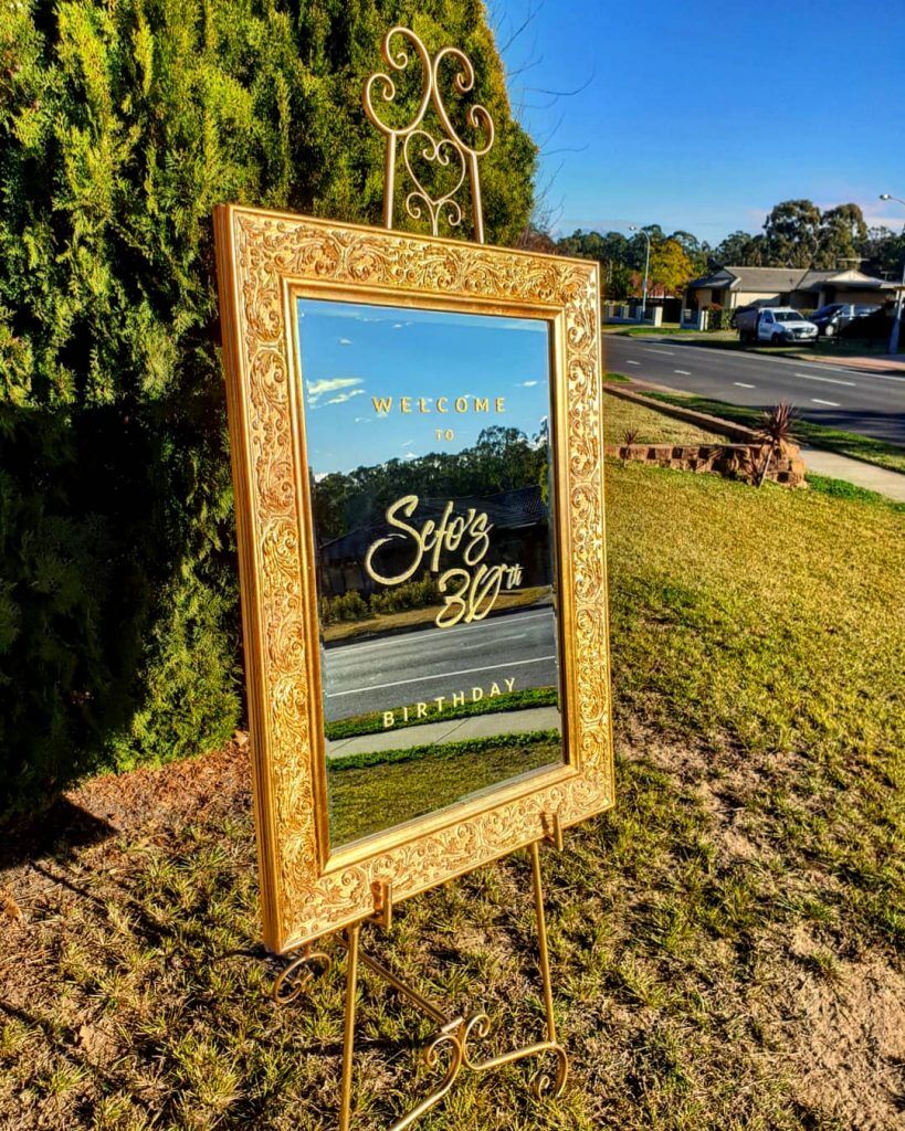 Large Gold Ornate Mirror can make a stunning addition to your wedding or event! Add a custom decal sticker or personal message to the mirror to create a truly unique sign for your next event.
